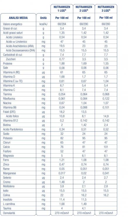 Il latte materno è l’alimento ideale. Se l’allattamento al seno non è possibile, Nutramigen 1 LGG è adatto per l’alimentazione del lattante dalla nascita fino al 6° mese di vita. Nutramigen 1 LGG® è una formula ipoallergenica a base di caseina estesamente idrolizzata per la gestione dietetica dell’allergia alle proteine del latte vaccino. È una formula nutrizionalmente completa, quindi è possibile usarla come unica fonte di nutrimento per soddisfare le esigenze quotidiane dei lattanti con allergia alle proteine del latte vaccino fino a 6 mesi di età.